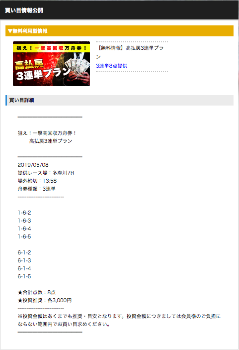 | 3連複プラン | 提供レース数:1〜2レース 予想内容:3連複 目標金額:投資金の15倍〜20倍 推奨金額:1万以内 予想公開時刻:12時前後公開 参加料金:0円〜6,000円以上 |